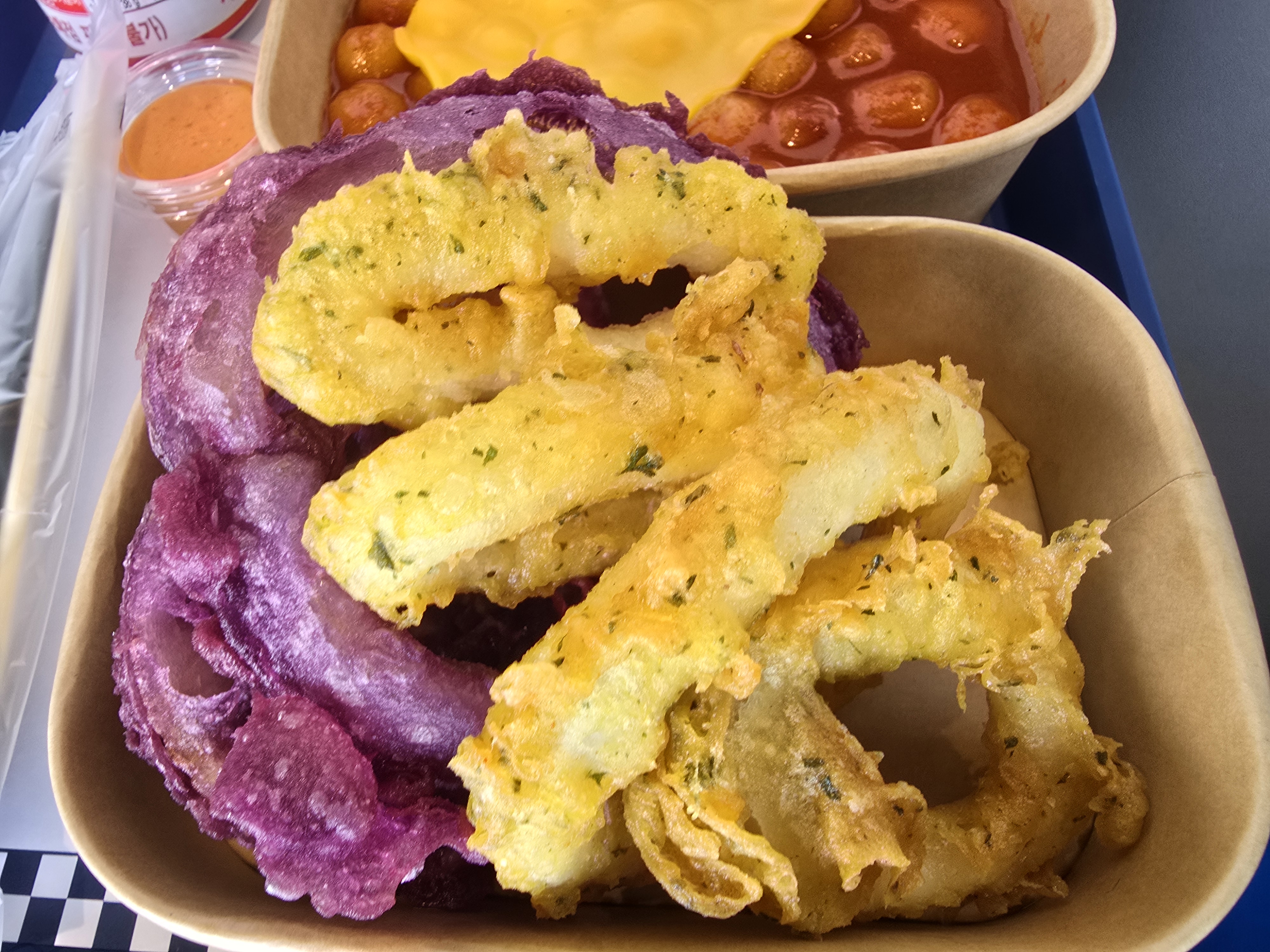 부드럽게 바삭한 오징어링 양파링 튀김 새트.